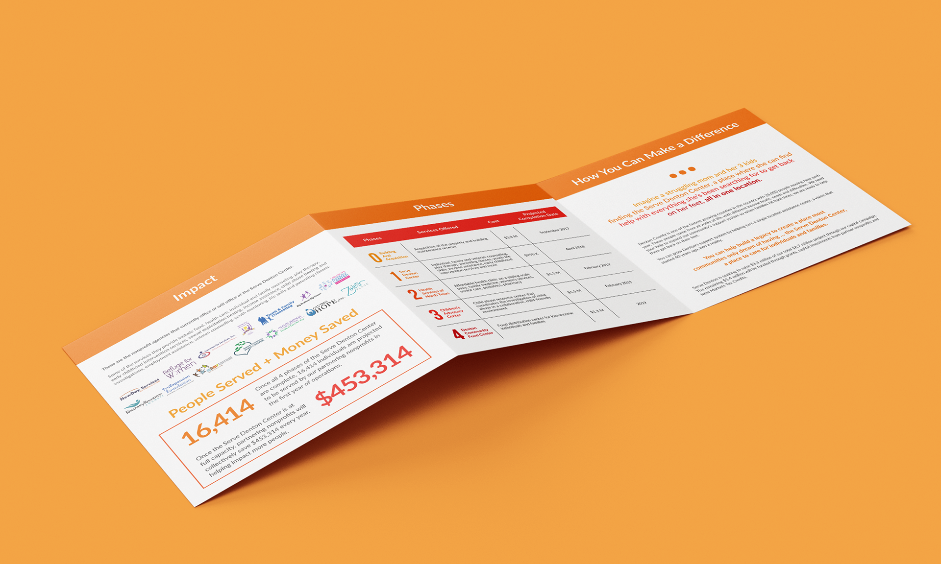 Serve Denton aims to be a one-stop-shop for social services, so those in need only have to visit one location to receive multiple services. The organization supports nonprofits that open doors for people to become self-sufficient, providing local nonprofits with affordable rent far below market rate so more of their money can go toward their mission instead of overhead costs. This tri-fold helps explain the full project for their Capital Campaign.