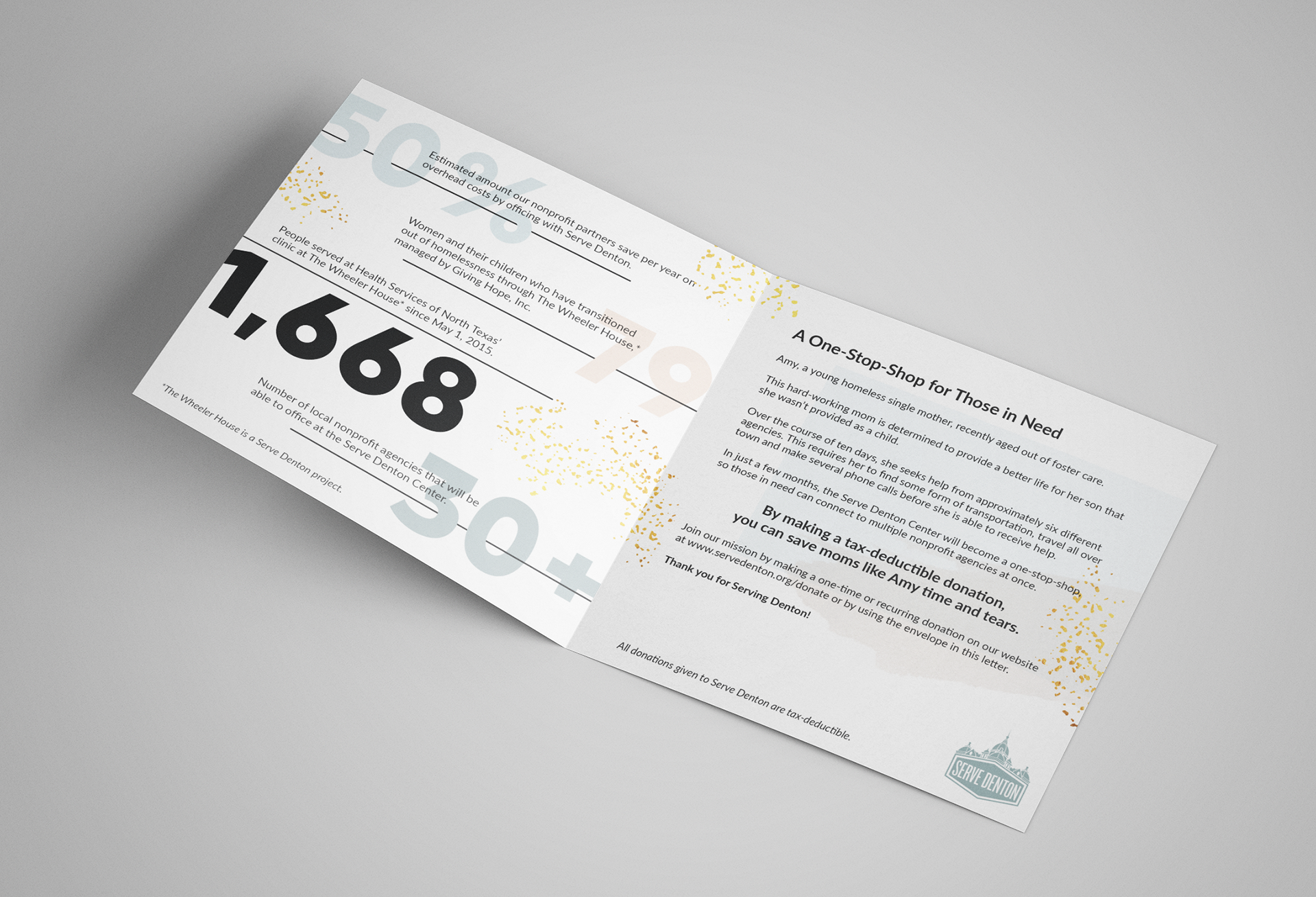 This was Serve Denton's first direct mail campaign asking for end-of-year donations. We aimed to create a "Christmas card" that people wanted to leave out all-year-round. Super happy with how the piece turned out!